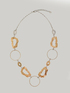 Collana lunga in metallo senza nichel; ciondoli tondi e ovali sagomati effetto silver e gold alternati; gancio per chiusura e catena con anelli per regolare la lunghezza.