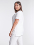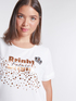 T-shirt in jersey di cotone stretch; scritta stampata effetto silver con cristalli cuciti; ricamo a forma di corona in perline sul lato sinistro; scollo tondo, maniche corte con un doppio bordo rifinito taglio vivo.