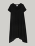Vestito lungo in jersey; il modello crea delle punte ai lati al fondo; scollo a V; maniche corte con risvolto al fondo.